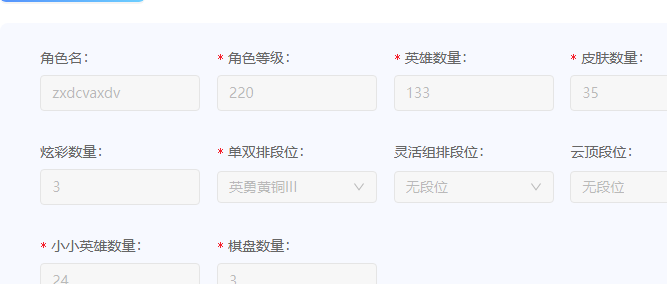 角色等级:220 角色名:zxdcvaxdv 排位赛:允许 单双排段位:英勇黄铜III 灵活组排段位:- 英雄数量:133 皮肤数量:35 分销起租时长:1 云顶段位:无段位 双人作战段位:无段位