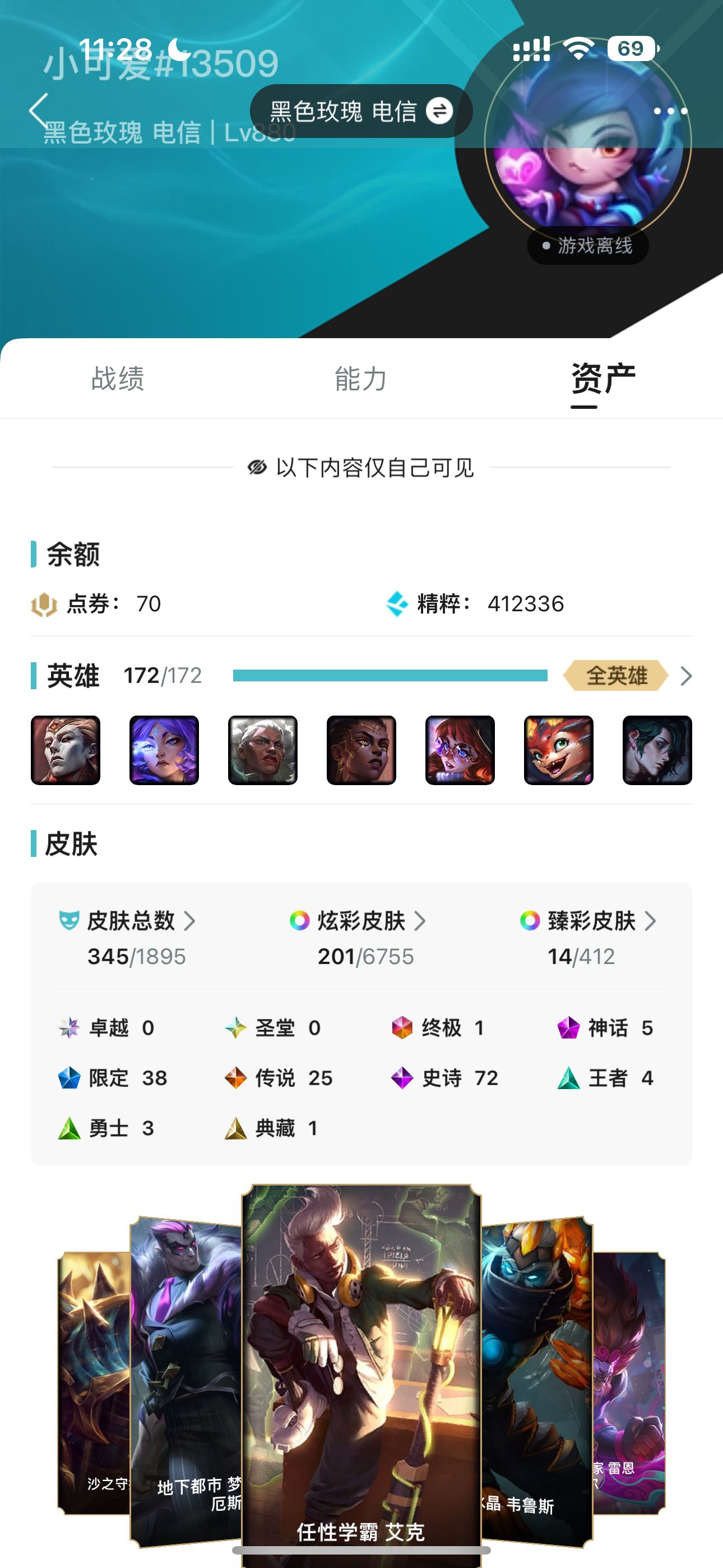 角色等级:881 角色名:小可爱 排位赛:允许 单双排段位:荣耀黄金II 灵活组排段位:- 英雄数量:172 皮肤数量:345 分销起租时长:1 云顶段位:无段位 双人作战段位:无段位