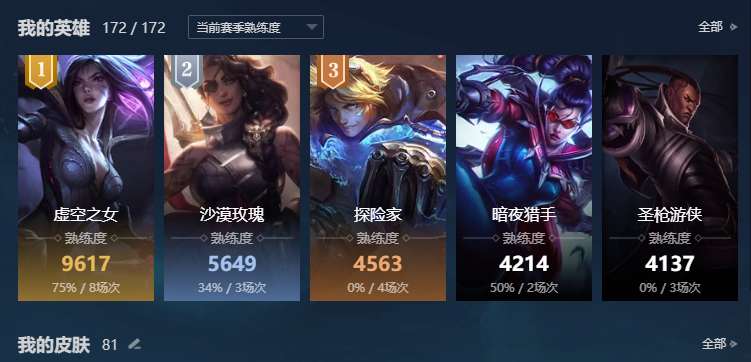 角色等级:273 角色名:Uzi 排位赛:允许 单双排段位:华贵铂金III 灵活组排段位:- 英雄数量:172 皮肤数量:81 云顶段位:无段位 双人作战段位:无段位