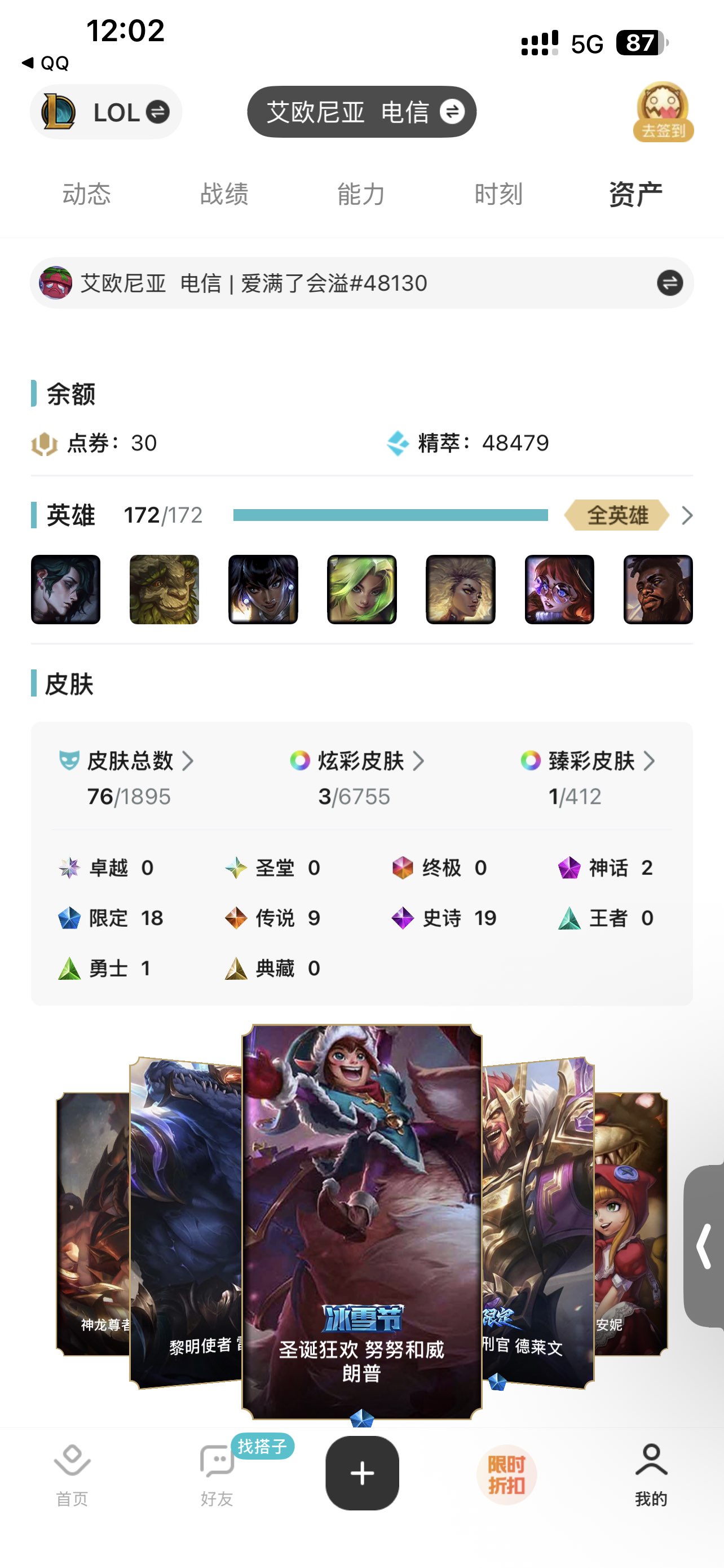 角色等级:127 角色名:爱满了会溢 排位赛:允许 单双排段位:英勇黄铜III 灵活组排段位:- 英雄数量:172 皮肤数量:76 分销起租时长:1 云顶段位:无段位 双人作战段位:无段位