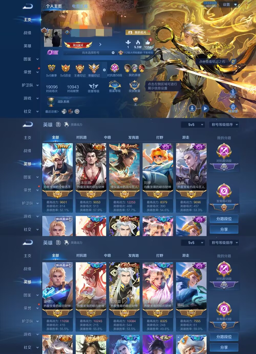 v10历史百星荣耀 10省标28市标 对抗58段562皮 4个万战5水(瑶羽兰白伽)3无双(曜乔瑶)4珍品87传1...